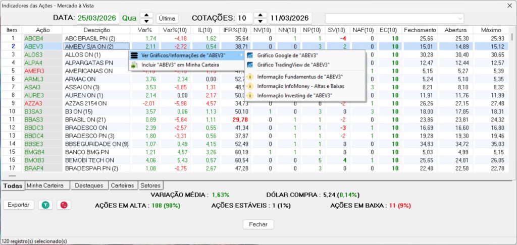 Analise as ações de qualquer mercado através dos indicadores do sistema, de acordo com o número de cotações desejado.