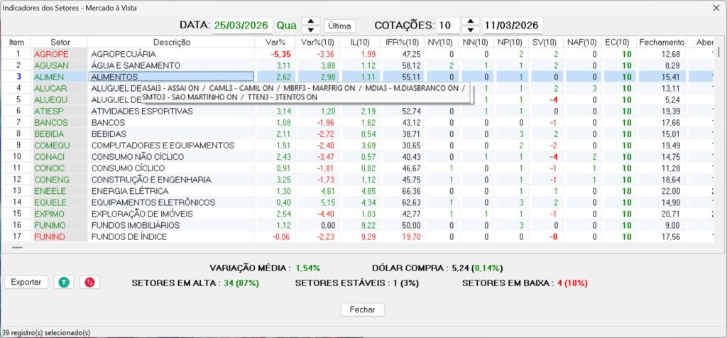 Analise os setores de qualquer mercado através dos indicadores do sistema, de acordo com o número de cotações desejado.