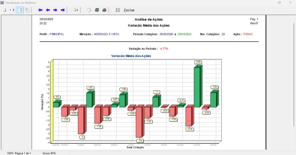 Veja a variação média de todas as ações ou de uma ação específica em um determinado período de cotações.